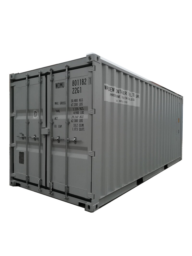 Container 20' Box Nuovo. mm 6059X2438X2591- INTERNE 5980X2340X2390. Portata 30 tonns . Container in Acciaio Corten steel S355J interamente saldato a cordone continuo. Montanti verticali spessore mm 6. Longheroni spessore 4/5. Traverse spessore mm 4/5. Pareti in lamiera Corten grecata spessore mm 1,6. Tetto in lamiera corten ondulata mm 2. Tasche per le Forche. Pavimento in legno Plywood marino idrofugo spessore 30 mm. Pavimento liscio caricabile (almeno 600 kgs mq). Uso magazzino oppure Uso Trasporto. Su anta sinistra è presente la TARGHETTA CSC "Container Safety Commition". Porte robuste a doppia anta con chiusura a doppia asta zincata e inganci sopra e sotto. Guarnizione in EPDM tipo "J" a tenuta stagna. Maniglie delle aste chiudibili con lucchetto. Per Blindare la porta sui container nuovi predisponiamo di Lock Box di sicurezza se richiesto .Verniciatura di Fabbrica, ciclo marino: Zincante 10 mircon, primer epossidico 40/60 micron, Vernice Acrilica 50/60 micron. Totale 110/120 micron. A richiesta Riverniciatura esterna, oppure Sabbiatura e riverniciatura con ciclo concordato da C3 a C5. Eventuale perizia per la Certificazione Rina o BV ABS, per la sicurezza della navigazione.Vari colori Blu, Grigio, Antracite, Crema,Waldem Container Produzione Vendita noleggio dal 1980, ISO 9001, Assistenza, Ricambi.